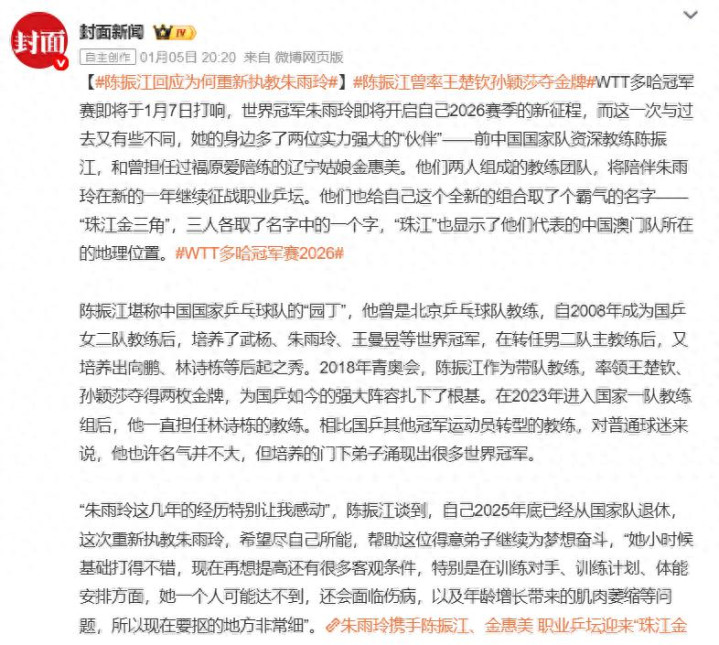 2026年1月初,陈振江正式确认离开国乒,与“外协”的朱雨玲组建“珠江金三角组合”。