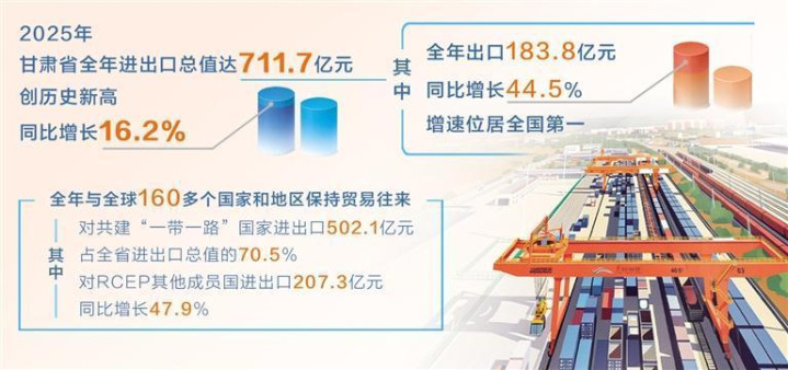每日甘肃网兰州讯(新甘肃·甘肃日报记者王占东)记者近日从兰州海关召开的新闻发布会上获悉,2025年甘肃省全年进出口总值首次突破700亿元,达711.7亿元,创甘肃省有进出口统计数据以来的最高纪录,同比增长16.2%,增速位居全国第六。其中,全年出口183.8亿元,同比增长44.5%,增速位居全国第一。